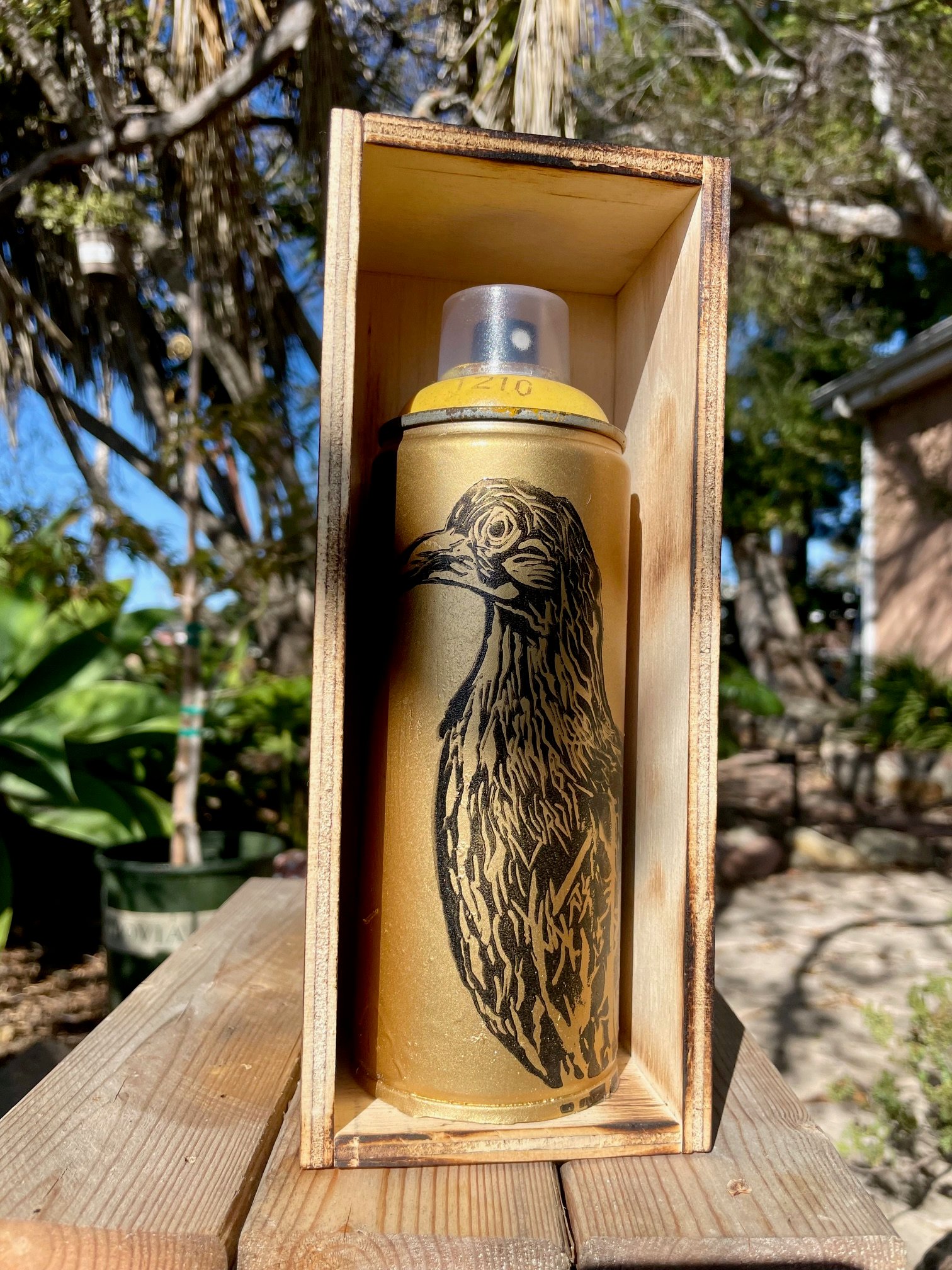 Linoleum carving of a NY Pigeon printed on semi used spray paint can. Comes with hand built Birch display case. Can only be shipped within US. Ground shipping.